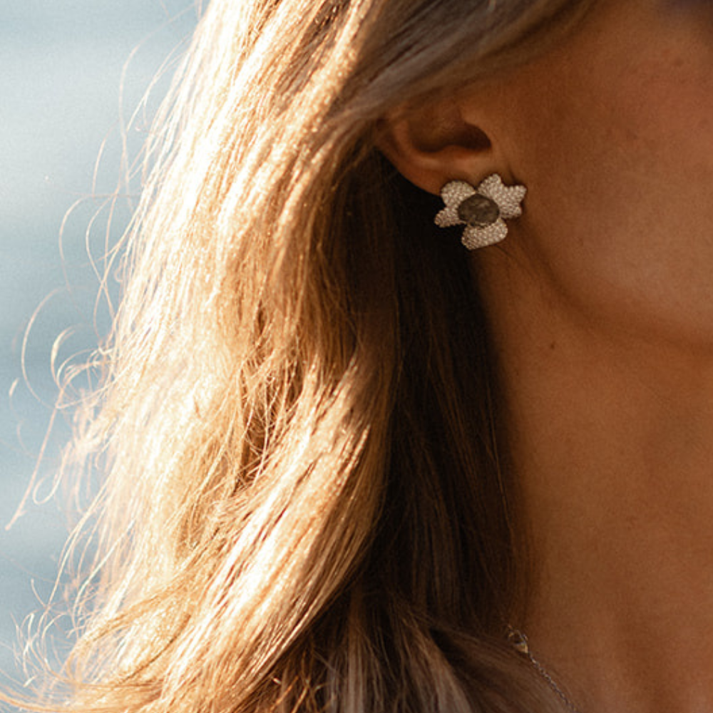 Crafted in brass with refined white gold plating and fitted with hypoallergenic 925 sterling silver posts, these earrings are comfortable for everyday wear while still standing out as a distinctive statement piece.