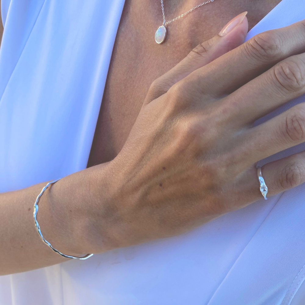 Miiya Asymmetrical Bracelet – elegant, effortless, and full of character. Handcrafted from solid 925 sterling silver, this unique piece features an asymmetrical, hammered design that catches the light with every movement. The adjustable fit ensures it wraps comfortably around your wrist, making it perfect for both everyday wear and special occasions. Whether worn solo or layered with your favorite pieces, this bracelet brings an artful, organic feel to your jewelry collection.